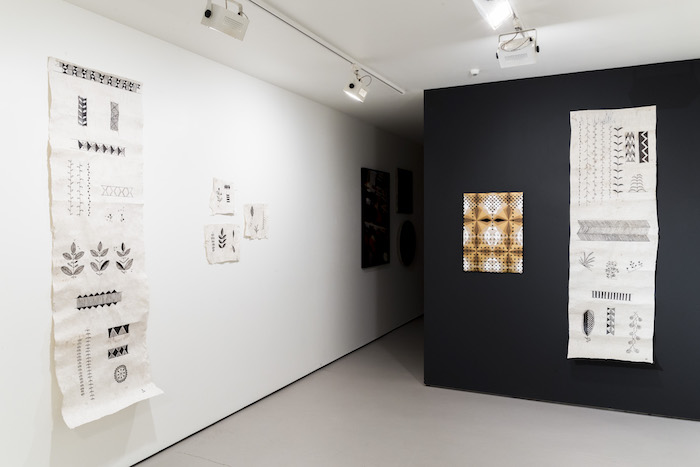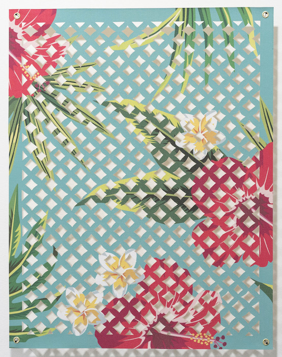2020 Lonnie Hutchinson wall paper, metal eyelets 800 x 500 mm Mangaia calling 2020 Lonnie Hutchinson wall paper, metal eyelets 800 x 500 mm Hiapo Sampler #1