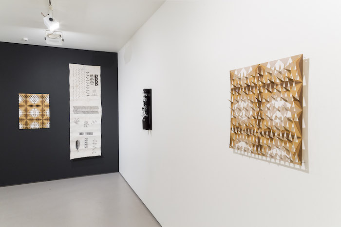 2020 Lonnie Hutchinson wall paper, nail polish, metal eyelets 540 x 540 mm Mangaia talking 2020 Lonnie Hutchinson wall paper, nail polish, metal eyelets 540 x 540 mm Tohu for Papa