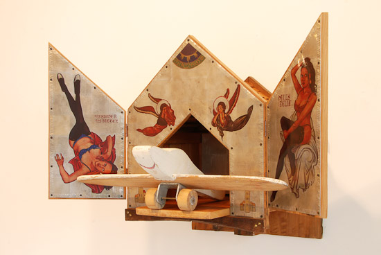 2011 Shane McGrath recycled timber, burnished tin, homemade toy, decals 350 x 570 x 355 mm Having dwelt in the house of holies 2011 Shane McGrath recycled timber, burnished tin, homemade toy, decals 350 x 570 x 355 mm Having dwelt in the house of holies (detail)